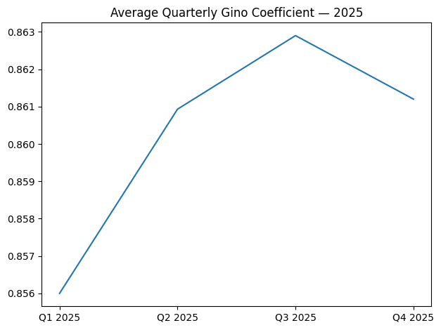 Across calendar year 2025, the headline Gino Coefficient remained elevated and structurally stable, beginning the 2025 year at 0.8539 in January and closing at 0.8612 by year-end. Quarter-level averages show a gradual upward drift from an average of 0.8560 in Q1 to 0.8609 in Q2, peaking at 0.8629 in Q3 before modestly easing to 0.8612 in Q4. Taken together, these movements indicate persistence rather than acceleration, with changes occurring incrementally rather than episodically. Month-to-month variation throughout the year remained narrow, with no abrupt inflections that would suggest redistribution events, issuance shocks, or structural regime change. When interpreted through a commodity lens, this pattern reflects durability of ownership rather than concentration risk in the equity sense.