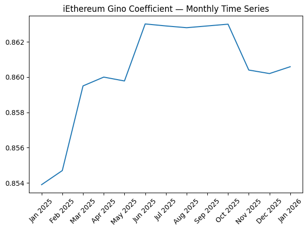 In summary, the Gino Coefficient across 2025 and into early 2026 reflects a neutral, durable, and structurally consistent ownership profile for iEthereum. Incremental increases over time align with commodity-like accumulation behavior rather than speculative redistribution, while the exchange-excluded metric clarifies that much of the observed concentration resides within liquidity and custody rails rather than among dominant economic actors. The metric is therefore most useful not as a signal of fairness or risk, but as a descriptive indicator of how a fixed-supply digital commodity is held, stored, and intermediated as it matures.