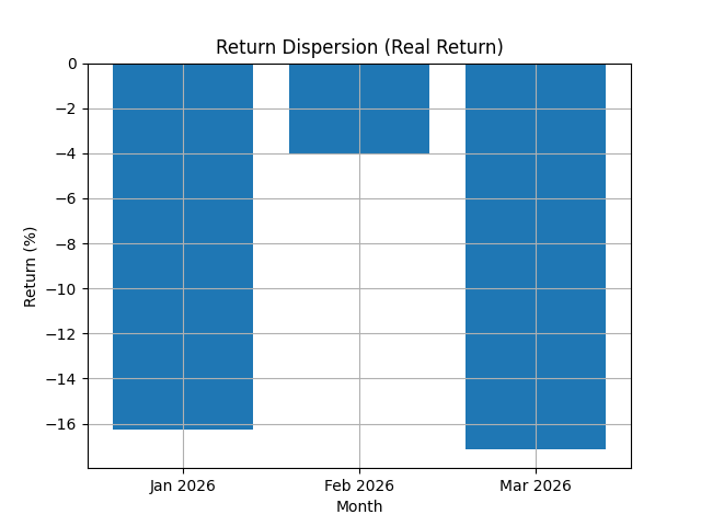 The dispersion characteristics of the dataset further reinforce the cyclical nature of the observed behavior. The quarterly dispersion range of 0.135 percentage points, combined with a best monthly return of -4.02% and a worst monthly return of -17.12%, suggests a compressed but consistently negative return distribution. The median monthly return of -16.27% indicates that the central tendency of the period aligns closely with the lower bound of the observed range, reflecting a persistent contraction rather than isolated volatility. This pattern reflects a short-term cyclical drawdown rather than structural instability, as the magnitude and clustering of returns remain within a defined and repeatable range.