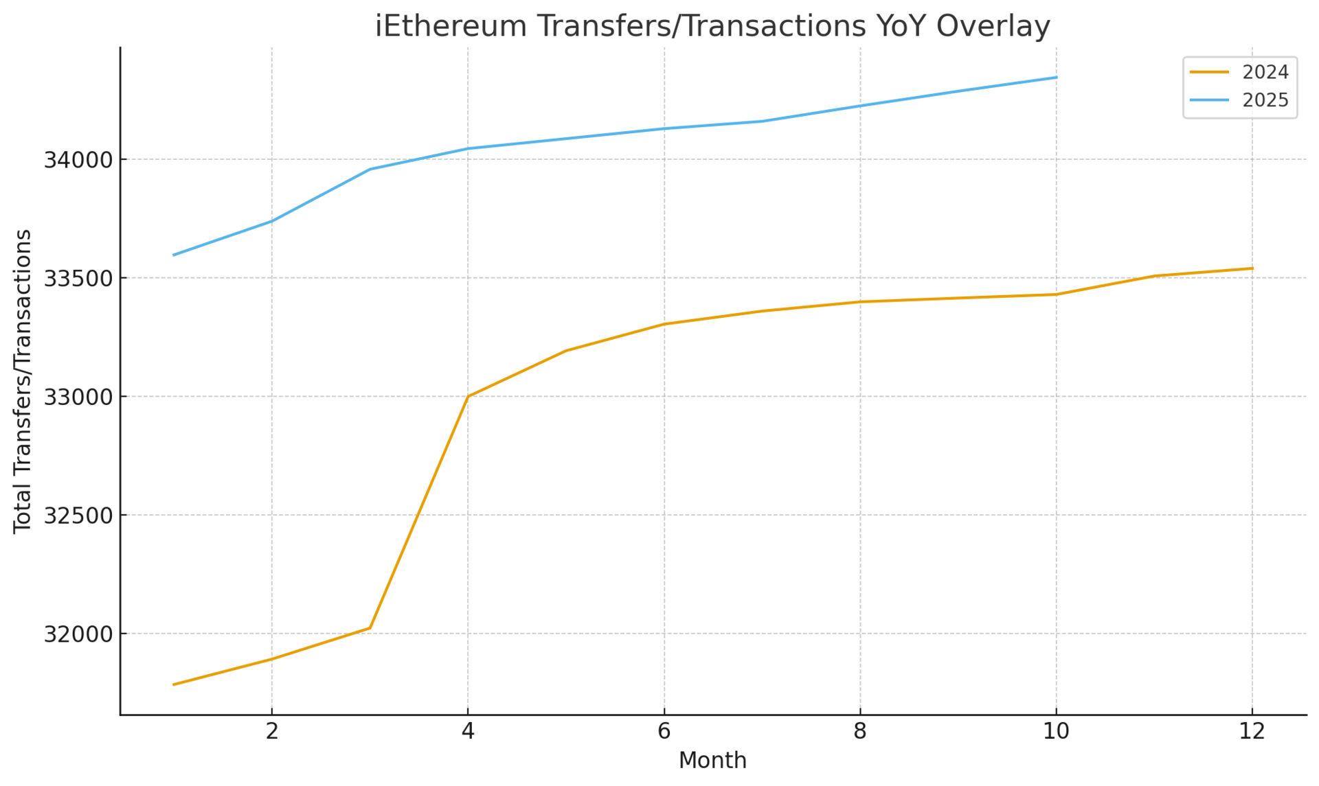Viewed month-over-month, the 2024 data traces a consistent upward glide from 31,786 transfers in January to 33,540 by December, with the most notable inflection point emerging between March and April as the count accelerated from 32,024 to 33,000. This step-change marked a transition from routine settlement traffic to a higher equilibrium of baseline usage, a shift that has persisted into 2025. By contrast, the 2025 progression, beginning at 33,597 in January and rising to 34,345 by October, reflects an even smoother ascent—fewer abrupt month-to-month dislocations and a more measured curve, suggesting that the earlier structural repricing of network activity has now stabilized into a predictable circulation cadence. When interpreted through a commodity lens, this pattern reflects the familiar behavior of resource-backed markets where supply is fixed, holders accumulate strategically, and transaction channels serve operational settlement rather than speculative rotation.