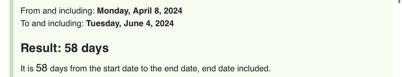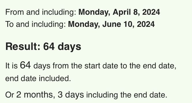 Between the Solar Eclipse on April 8th and June 10, 2024, the start of the Apple 24 developer conference, there are 64 days.