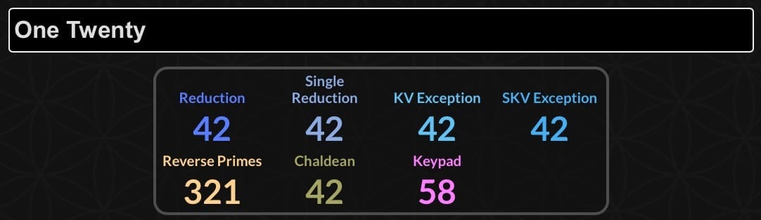 Additionally, the 120-day is significant to this riddle. If we input 120 written in alpha form “One Twenty” or “One Two Zero,” into the gematria calculator, we get numbers connected to the riddle, including numerous 42’s, 58 (tying into Super Bowl 58), 55 and 321 connecting to Satoshi.