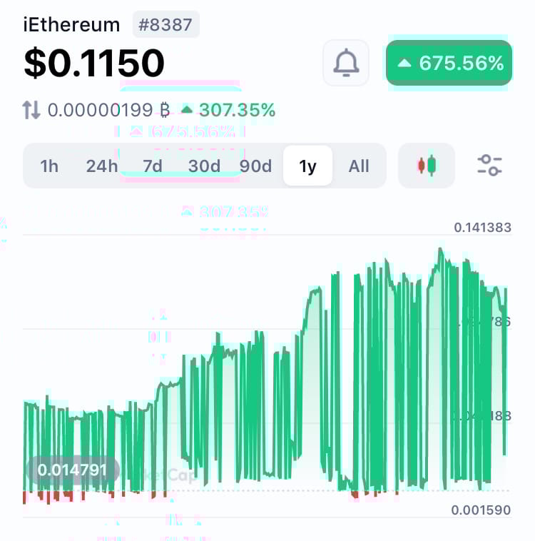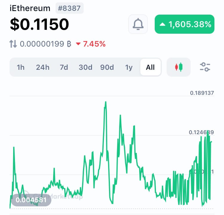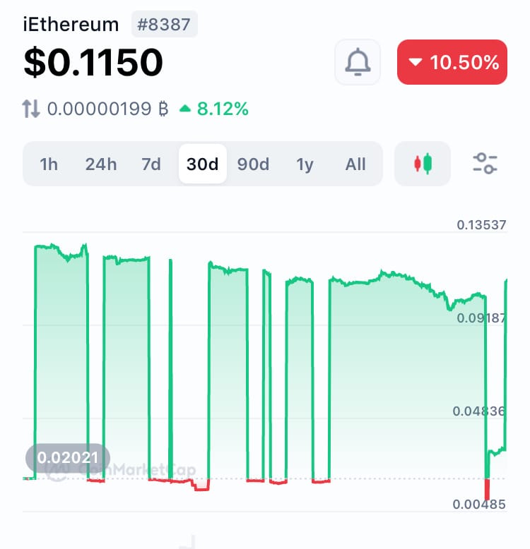 Low Volume Coin: iEthereum's low trading volume results in extreme price fluctuations. iEthereum is traded in pairs, mainly with BTC and ETH. If there is no trading volume at a given moment, the price remains constant in BTC or ETH terms. However, if the price of Ethereum or BTC changes, the USD price of iEthereum fluctuates accordingly. For instance, if the price of iEthereum in ETH is 0.00000613 and Ethereum drops from $4000 to $3000 USD, the iEthereum USD price will change from $0.02452 to $0.01839—a 33.33% change without any trades. Although this makes technical sense, it does not fully explain why iEthereum fluctuates between $0.02 and $0.13. The recent drastic price drop in Ethereum did change the price of iEthereum by 33.3%, but this theory alone doesn't explain the consistent fluctuations.